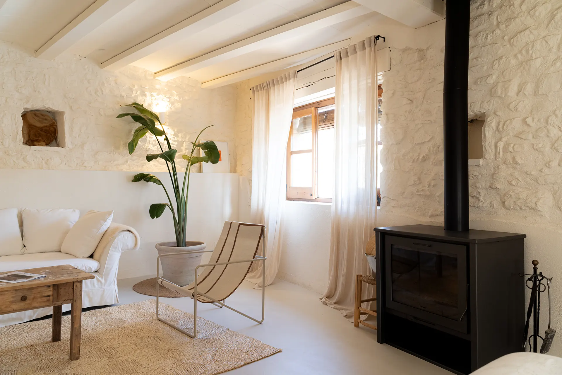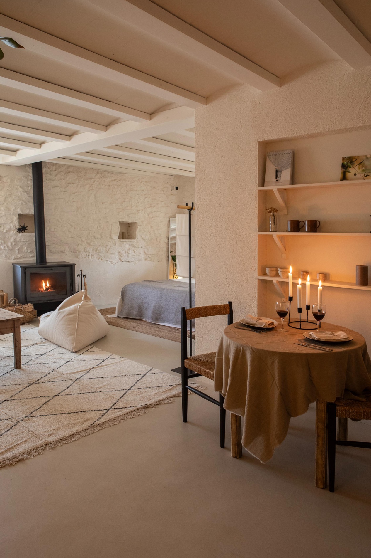 Espacio diáfano con cama de 160 cm, chimenea junto a la cama, cocina integrada y baño con ducha.