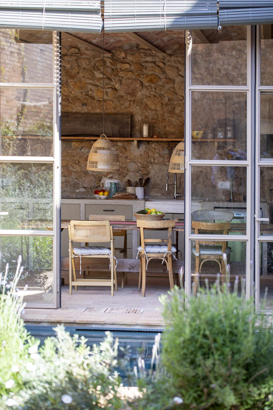Zona de cocina con ventanales panorámicos, vistas al jardín y a la piscina, que se pueden abrir completamente para conectar el interior con el exterior