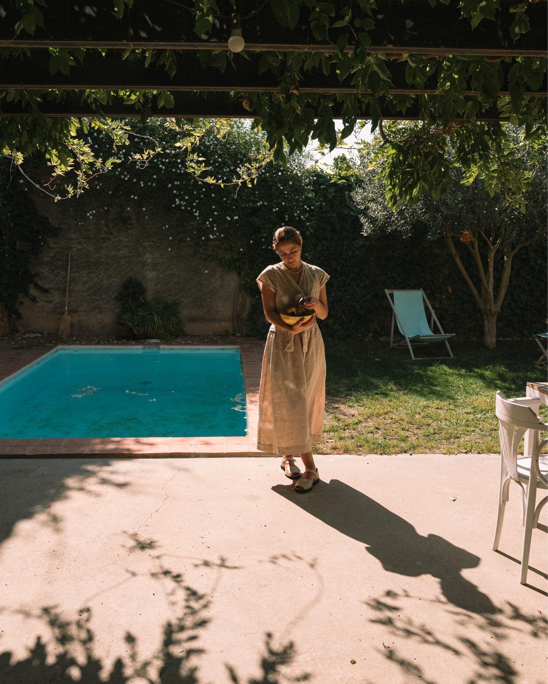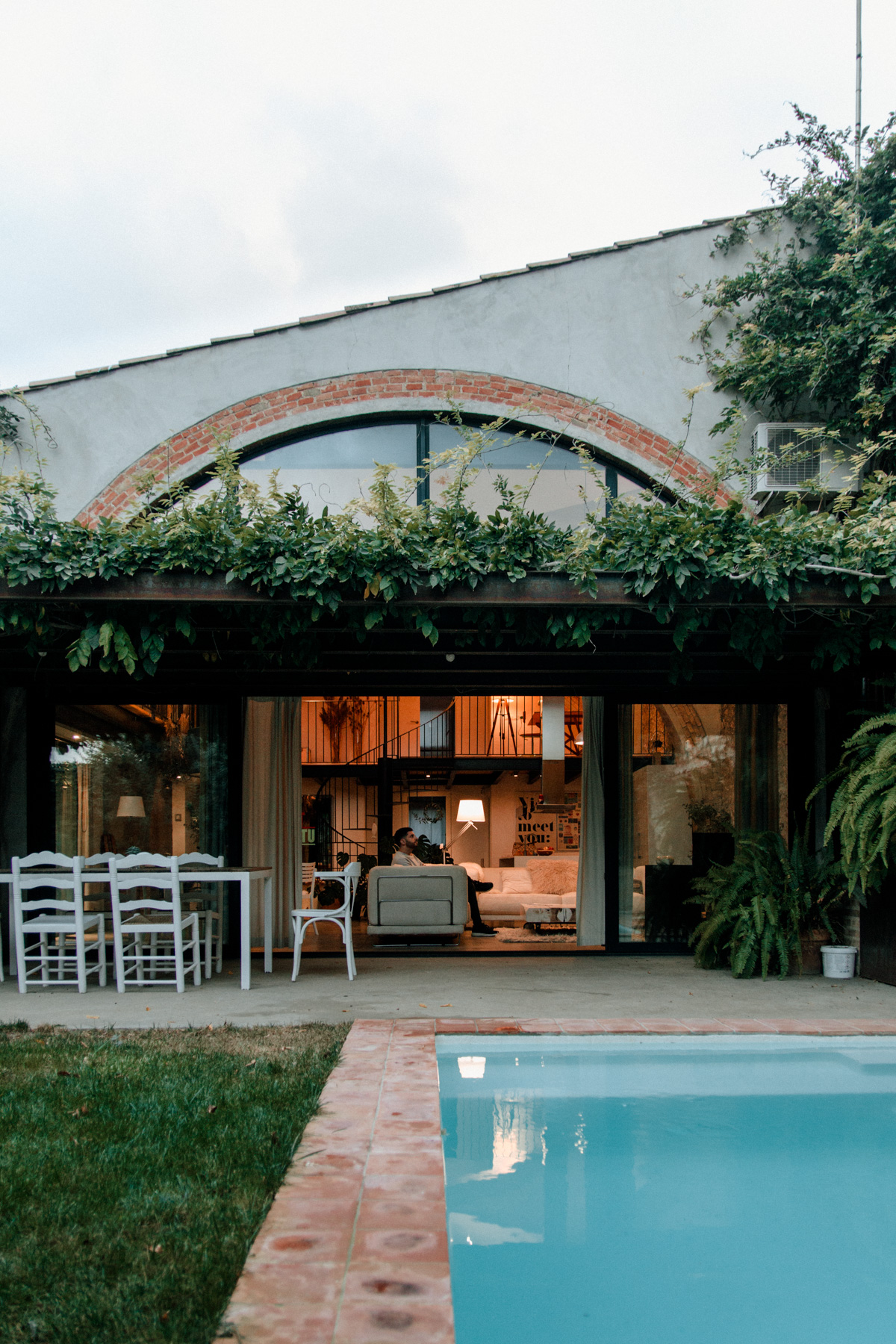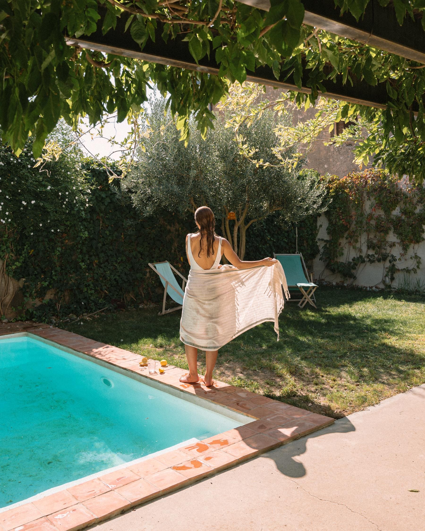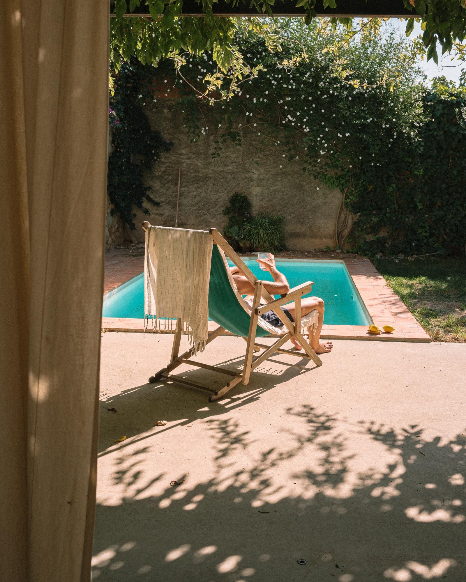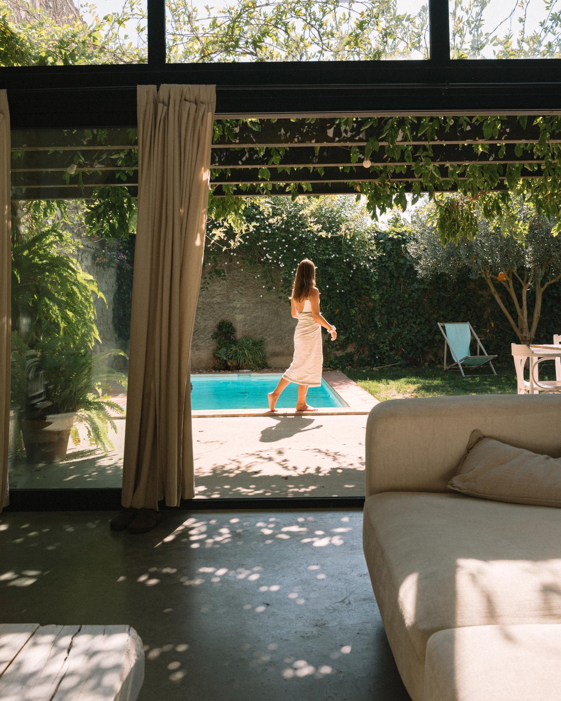 Private garden with pool, outdoor porch with dining table, sun loungers, and barbecue.